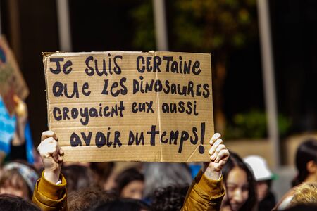 French sign held by ecological activist. A closeup view of environmental demonstrators holding a French sign saying young people are right, adults have the wrong reason during a protest.