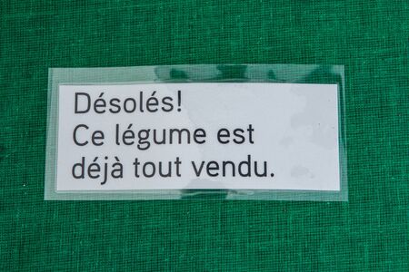 French sign at outdoor farmer's market. A small French sign saying sorry, this vegetable is already sold, is viewed closeup on a market stall with sold out produce, against a green background.