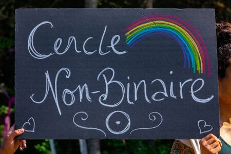 two hands holding French Homemade black poster, A closeup view of a French poster, saying Cercle Non-binary during a rally in Montreal, Canada