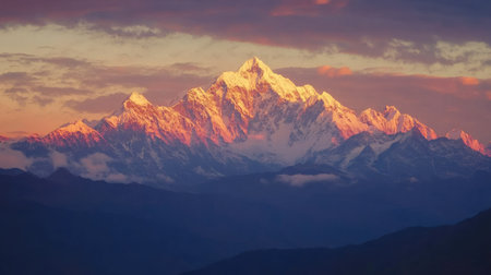 Sunrise over the South Asian Himalayas, with snow-capped peaks and sky for inspirational text.