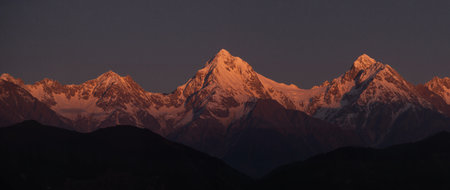 Mountain silhouette of Panchchuli peaks during morning sunrise in great Himalayan mountain chain range from Khalia Top at small hamlet Munsiyari, Kumaon region, Uttarakhand, India.