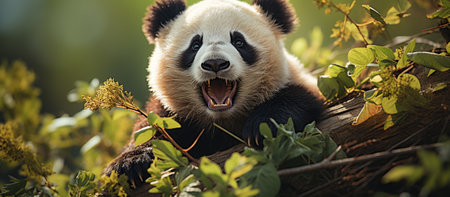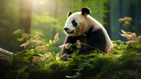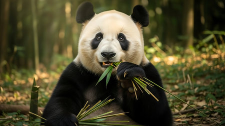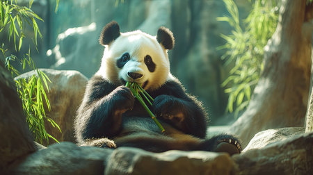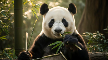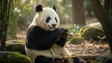 A panda bear is shown eating bamboo in a natural setting. The image features the animal with its distinctive black and white fur, surrounded by green bamboo and trees. The lighting suggests sunlight filtering through the foliage. Suitable for various editorial and commercial applications.