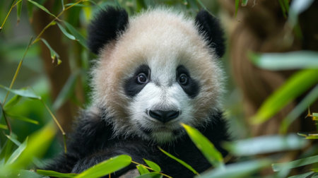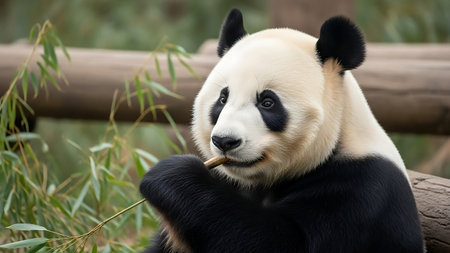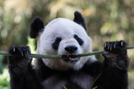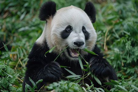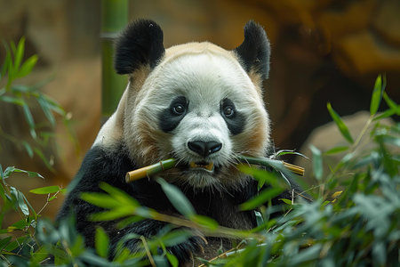 This image features a giant panda, focused on eating bamboo. The panda has distinct black and white fur, complemented by green bamboo leaves. The composition is a close-up, and the lighting is soft and natural. This image could be used for various projects, including editorial illustrations or educational materials.