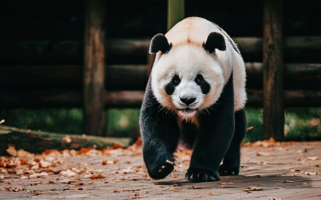 A giant panda in the zoo walks through the autumn leaves.
