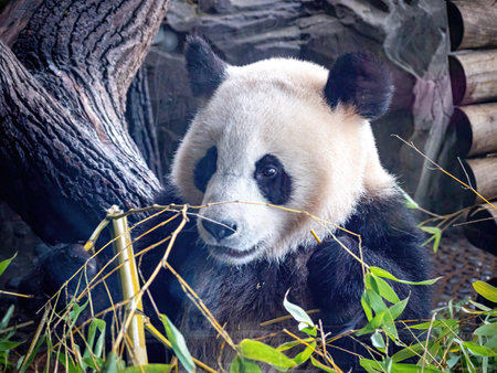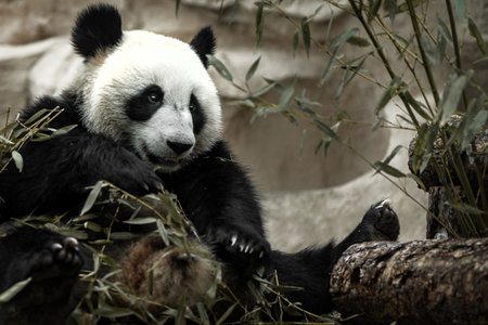 Rare and protected animals. Cute giant panda eating bamboo in the zoo.
