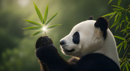 A close-up profile of a giant panda gently holding a bamboo stalk that emits a magical glow from its joint. The panda has a peaceful expression, set against a blurred green forest background.