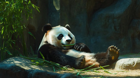 A panda relaxing in the zoo, laying down with bamboo in its paws, chewing leisurely while enjoying the calm atmosphere of its enclosure