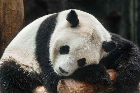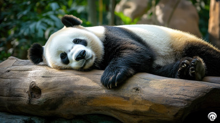 Giant panda bear asleep on a log in a zoo, looking relaxed and comfortable in its surroundings. Perfect for wildlife conservation campaigns.