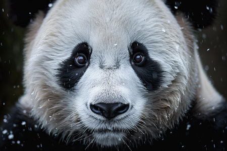 A panda bear with black and white fur is looking at the camera. The image has a moody and mysterious feel to it, as the panda's eyes are the only thing visible in the frame