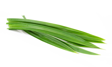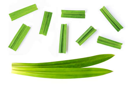 Fresh green pandan leaf and slice ( Pandanus amaryllifolius come ) isolated on white background. Top view. Flat lay.