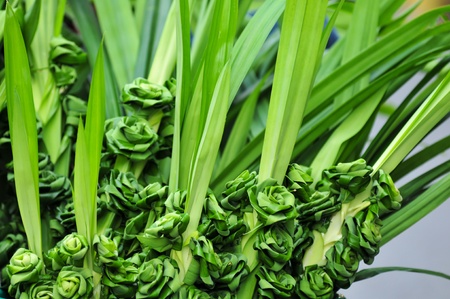 Bouquet of roses flowers handmade from folded fragrant pandan leaves, isolated on black background