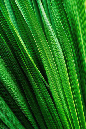 A vibrant close-up of fresh green grass blades showcasing the intricate textures and colors found in nature, perfect for depicting the beauty of outdoor environments.