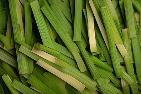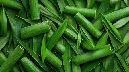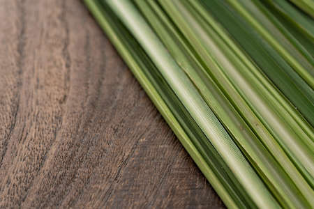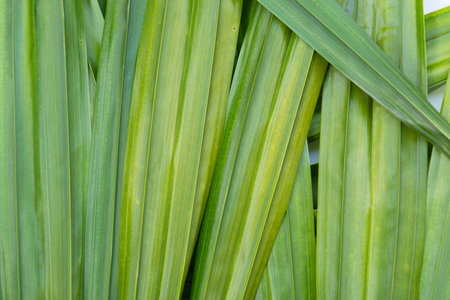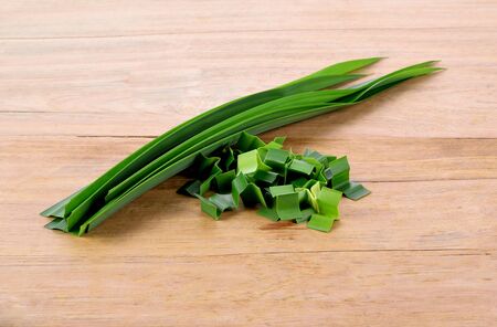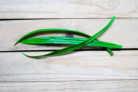 Close-up of green leaves of pandan leaves, pandan leaves, isolated on a color background, paved with cuttings