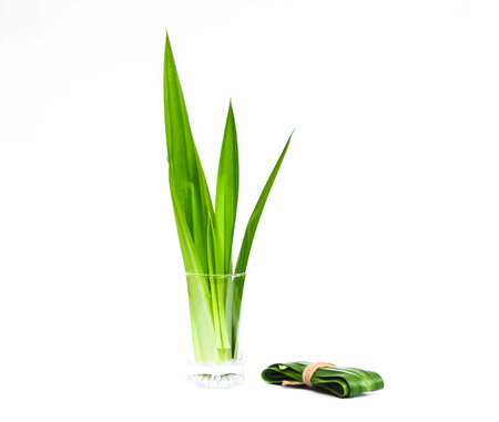 Fresh green pandan leaf ( Pandanus amaryllifolius come ) and glass of pandan ice tea isolated on white background. Natural herbal plant and healthy drinks concept. Top view. Flat lay.