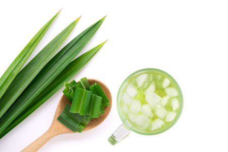 Fresh green pandan leaf ( Pandanus amaryllifolius come ) with slice in wooden spoon and glass of pandan ice tea isolated on white background. Natural herbal plant and healthy drinks concept. Top view