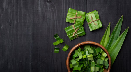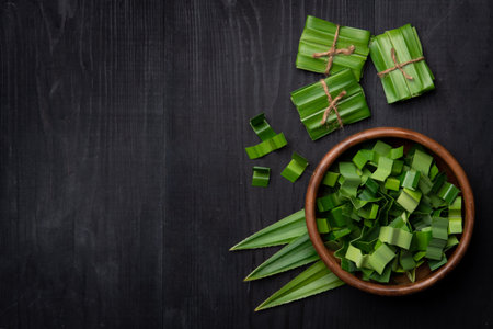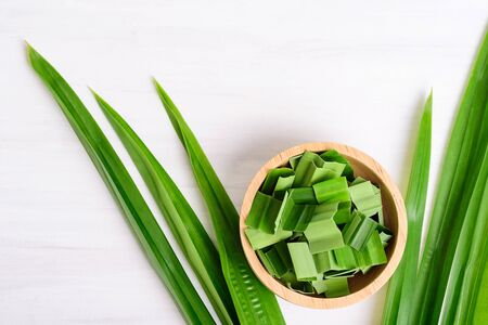 Sliced pandan leaf in a bowl, pandan leaf used to enhance the flavoring and color in Asia food and dessert