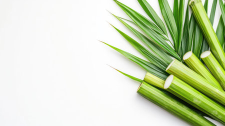 A beautiful arrangement of fresh green bamboo stems and tropical leaves on a clean white background, perfect for minimalist home decor and organic design.