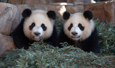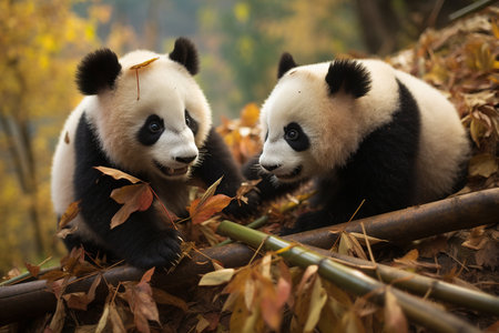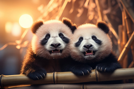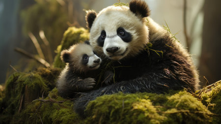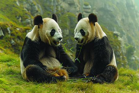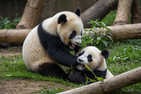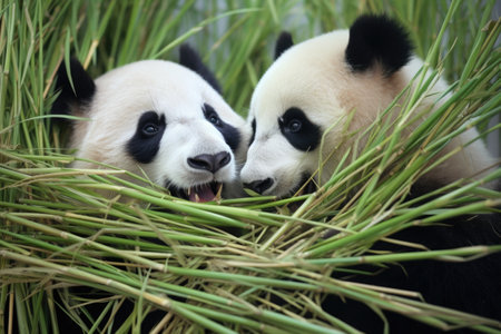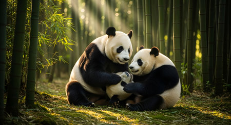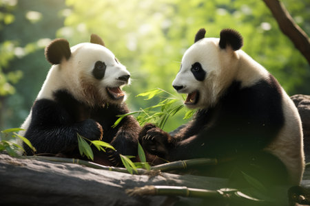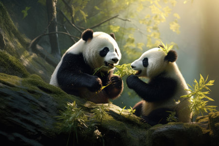 Two pandas are depicted enjoying bamboo shoots in their natural habitat. The image shows a medium shot with focus on the animals. The scene is illuminated by natural light, showing the pandas with contrasting black and white fur. It could be used for wildlife documentaries, educational content, or illustrative purposes.
