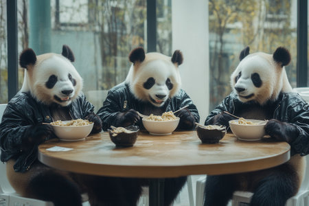 Panda bears having a bamboo feast in the forest. Created with Generative AI technology
