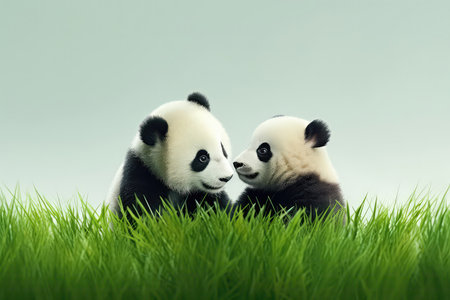 cute cuddly panda babies playing with each other in the green grass. ai generative.