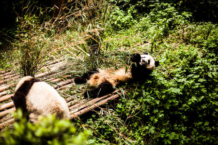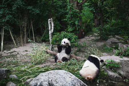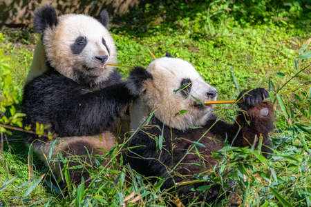 Two giant panda bear eating bamboo in the zoo. Chengdu, China