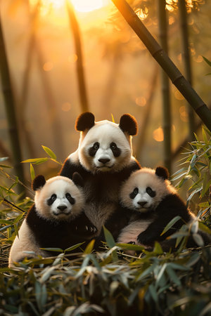Three pandas nestled in lush bamboo forest, basking in soft, golden light