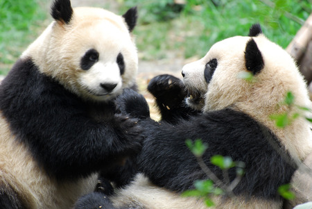 Two Giant Pandas (Ailuropoda melanoleuca) playing together at the Giant Panda Breeding Research Base in Chengdu, China