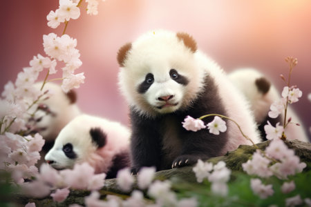 A majestic group of playful pandas frolic among a vibrant sea of blooming flowers, basking in the freedom of the great outdoors