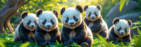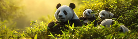 Panda bear family at the rain forest with setting sun shining. Group of wild animals in nature. Horizontal, banner.