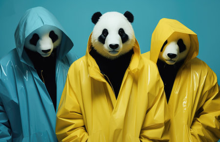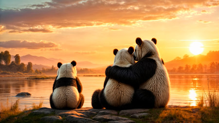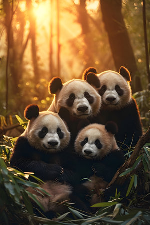 Panda bear family at the rain forest with setting sun shining. Group of wild animals in nature.