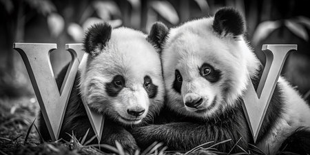 Two pandas sit in the park and eat bamboo, the panda is an endangered animal, the Chinese bear, generative AI.
