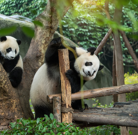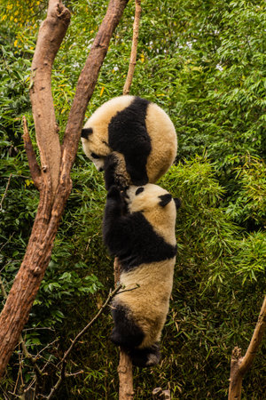 Two Giant Pandas (Ailuropoda melanoleuca) climbing a tree at the Giant Panda Breeding Research Base in Chengdu, China