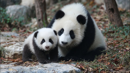 Close-up of a Giant Panda and a Baby Panda in a Forest. Concept of wildlife, animal family, endangered species, nature. Vertical.