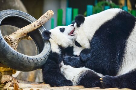 Giant panda bear with her baby in a zoo. Wildlife scene from nature.