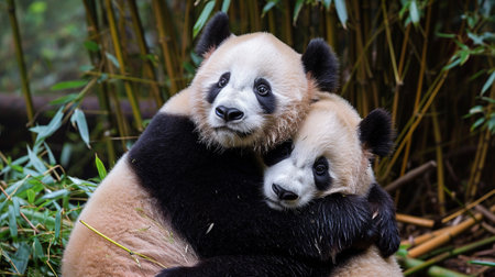 Giant pandas, bear pandas, baby panda and her mom hugging each other