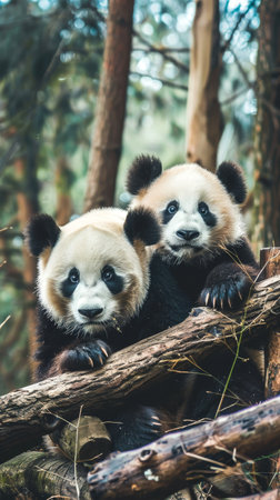 This delightful image captures a cute panda bear sitting and playfully engaging with tree trunks. The panda's innocent expression and playful demeanor bring a sense of joy and whimsy to the scene. With its fluffy black and white fur, the panda appears at ease as it explores its arboreal playground.