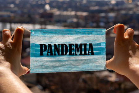 Protective mask in hands backdrop of the city.inscription mask pandemic, Face mask protection against pollution, virus, flu and coronavirus. Health care and surgical concept.