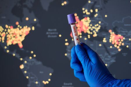 A hand of a laboratory assistant specialist holding a coronavirus blood test against a world map. A world map with confirmed cases of COVID-19. Coronavirus disease situation update worldwide spread