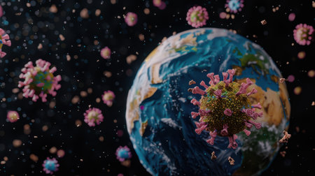 A 3D rendering depicts Earth floating in space, surrounded by a multitude of virus particles, emphasizing the global threat posed by infectious diseases.