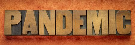 pandemic word in letterpress wood type against textured handmade paper, covid-19 coronavirus outbreak concept