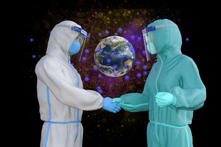 Medical professionals from around the world, wearing face shields and protective gear, are working together to protect the planet.3D illustration