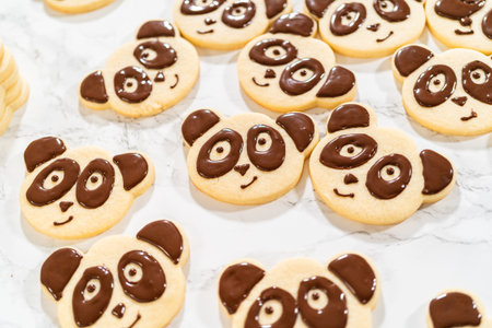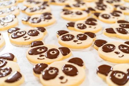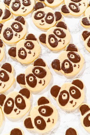 Overhead view of a batch of panda cookies with completed chocolate icing designs for the Chocolate Royal Icing Recipe. Each cookie features a cute panda face, giving a uniform and adorable look.