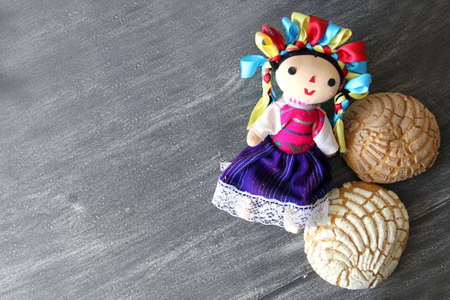 Talavera mug with coffee and Mexican sweet bread, and handmade doll