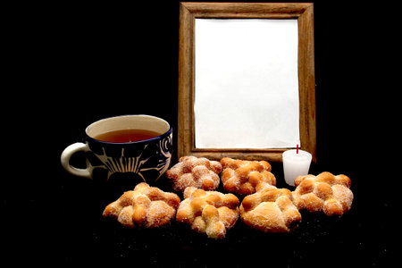 Fluffy and sugary bread of the dead in an offering for the Day of All Saints and All Saints in November in Mexico with coffee, candles and picture frames with the image