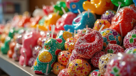 Colorful handcrafted Mexican candles at a traditional market display. That the image is generated using AI.