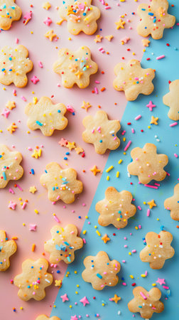 Flower-shaped cookies with colorful sprinkles on pink and blue background