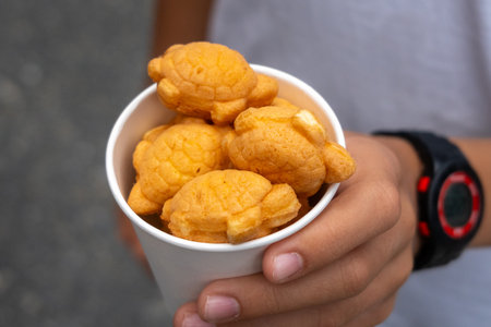 A person holds a paper cup filled with golden, turtle shaped taiyaki pastries, a playful and sweet Japanese street snack found in Osaka
