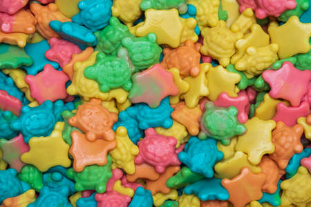 Background or texture of multicolored chewing candies in the form of a turtle close-up in full frame. The concept of unhealthy children's food.