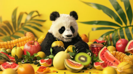 Panda bear sitting among fresh fruits and vegetables on yellow background.
