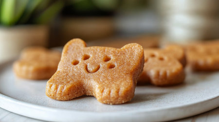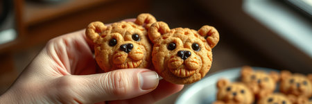 Delightful bear-shaped cookies are held in hand with more treats in the background at a cozy kitchen setting